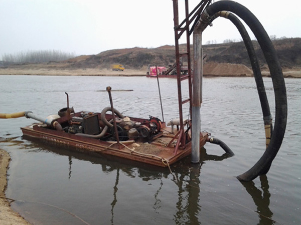 【4】普通抽沙船每小 時可從水下3-15米深處抽取、篩選沙15-150立方米/小時,船艙整體分為三體,兩頭為浮體、中間為沙艙。行走速度為15km/小時,柴油機帶動掛漿機。